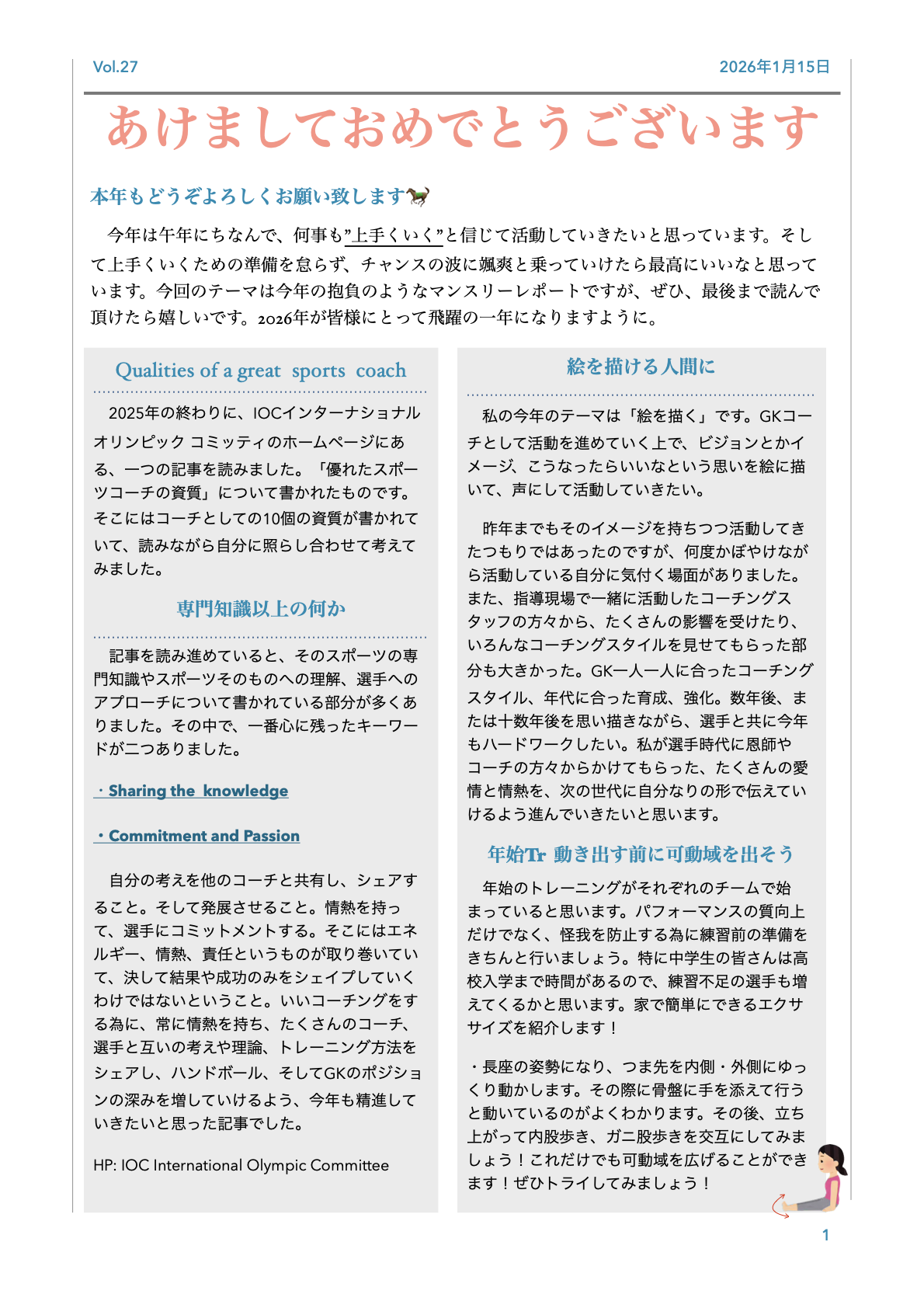 今回のマンスリーレポートは私の2026年の抱負と、IOCのホームページにある、「トップコーチの資質」についての記事について少し書きました。